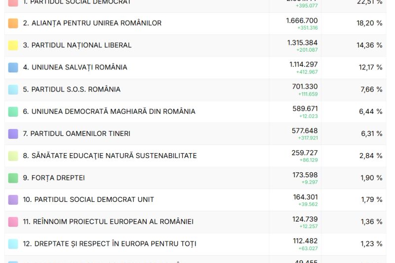 Biroul Electoral Central a numărat voturile din peste 99% dintre secții. Conform datelor de până la această oră, șapte partide vor avea reprezentanți în Senat și Camera Deputaților în viitorul mandat. În prezent, ordinea partidelor după alegerile parlamentare este PSD, AUR, PNL, USR. Este însă puțin probabil să apară schimbări având în vedere că numărătoarea voturilor la alegerile parlamentare 2024 este aproape finalizată.