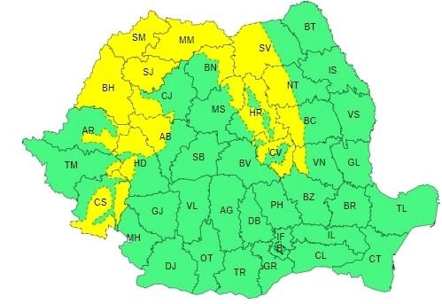 Meteorologii au emis atenționări cod galben și portocaliu, iar prima avertizare va fi în vigoare de joi, de la ora 22.00, până vineri, la ora 12.